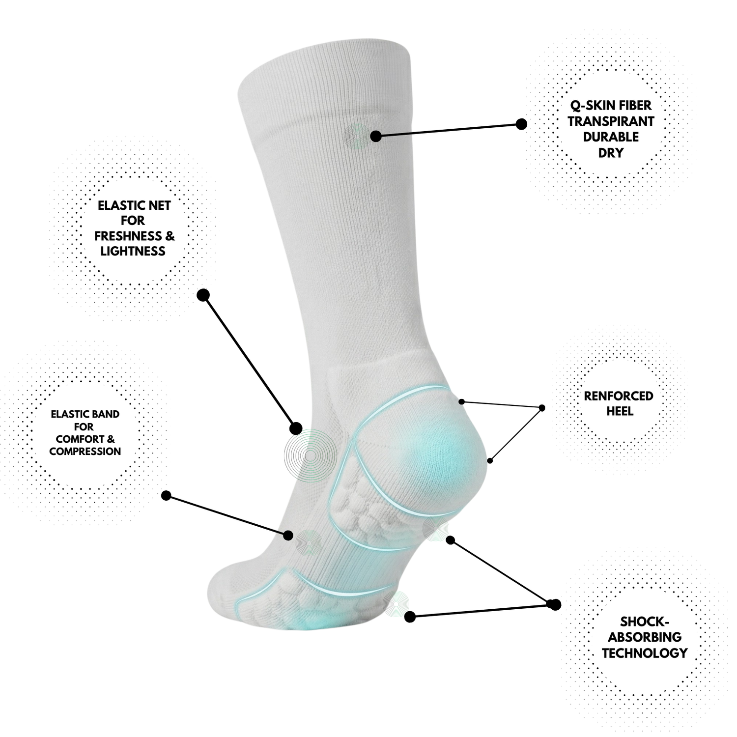 Saisei Socks si impegna costantemente nella ricerca dei tessuti e delle fibre più pregiate. Grazie alla filosofia del brand, è stato possibile creare delle calze tecniche dotate di tecnologia shock-absorbing, in grado di assorbire uniformemente le vibrazioni e prevenire lesioni che potrebbero derivare da un'intensa attività fisica. Le calze combinano la fibra QSKIN in ioni d'argento ad una soletta rinforzata, per garantire comfort, igiene e durata. Made in Italy.